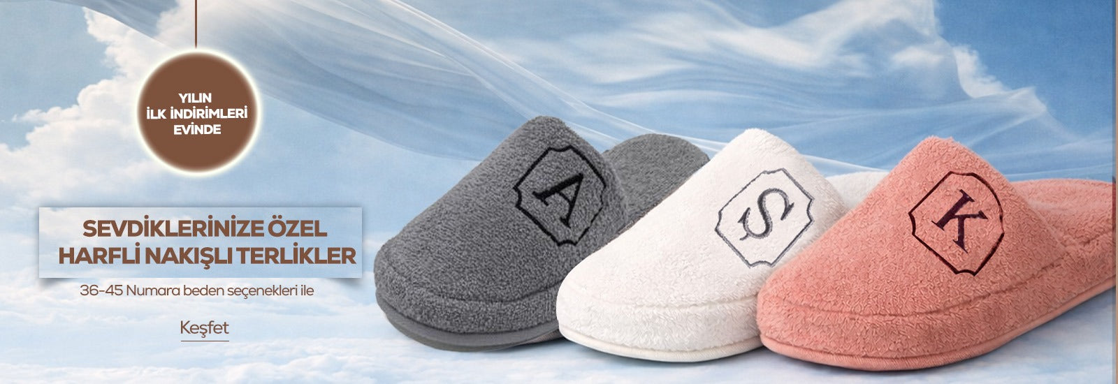 E Harf Nakışlı Banyo Ve Ev Havlu Terliği – %100 Pamuk Kaymaz Kalın Taban