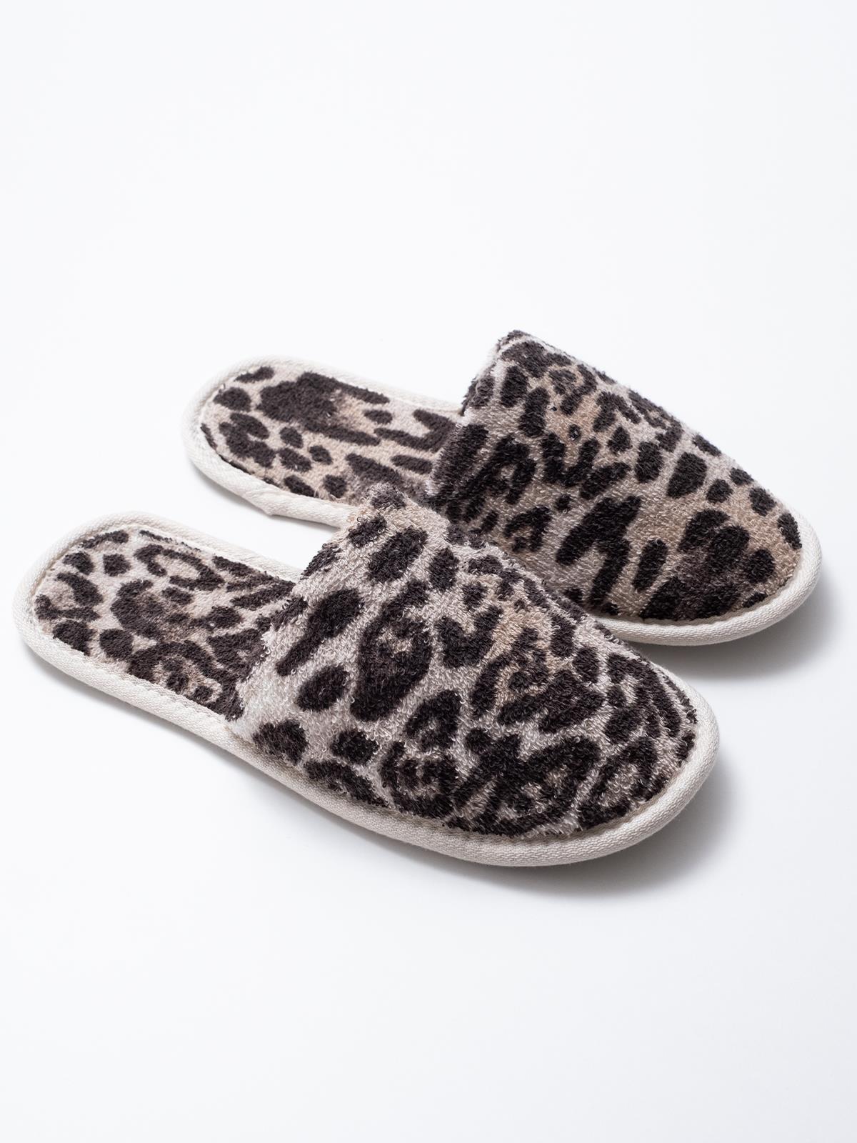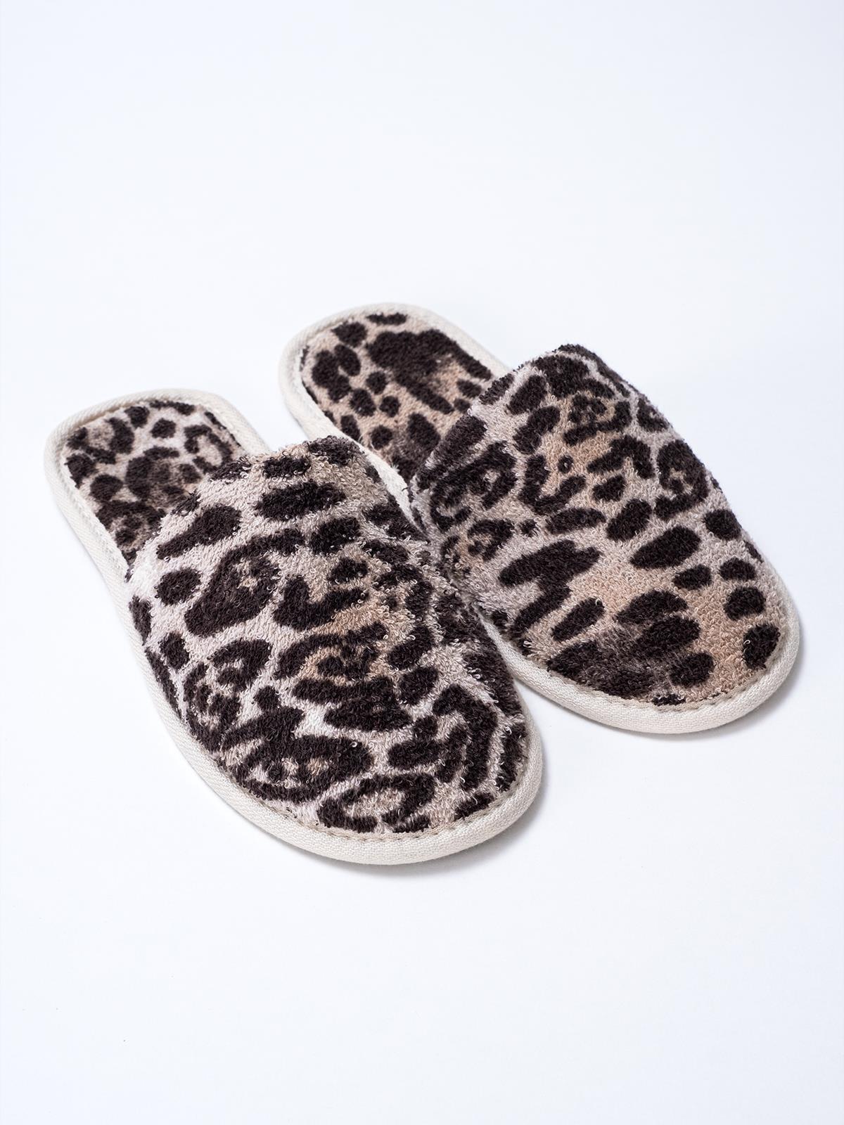 Wild Spirit Leopar Desenli Banyo Ve Ev Terliği – %100 Pamuk Havlu Kaymaz İnce Taban Leopar Baskılı- Ekru Biyeli