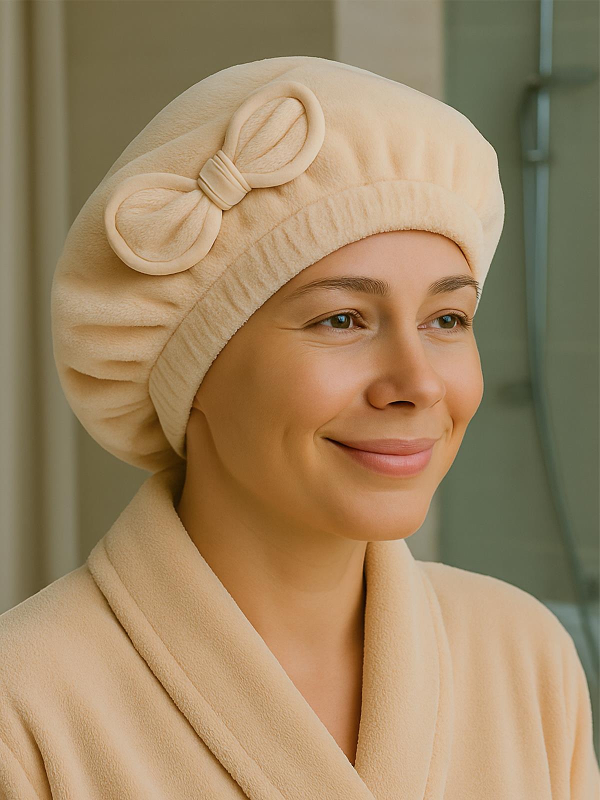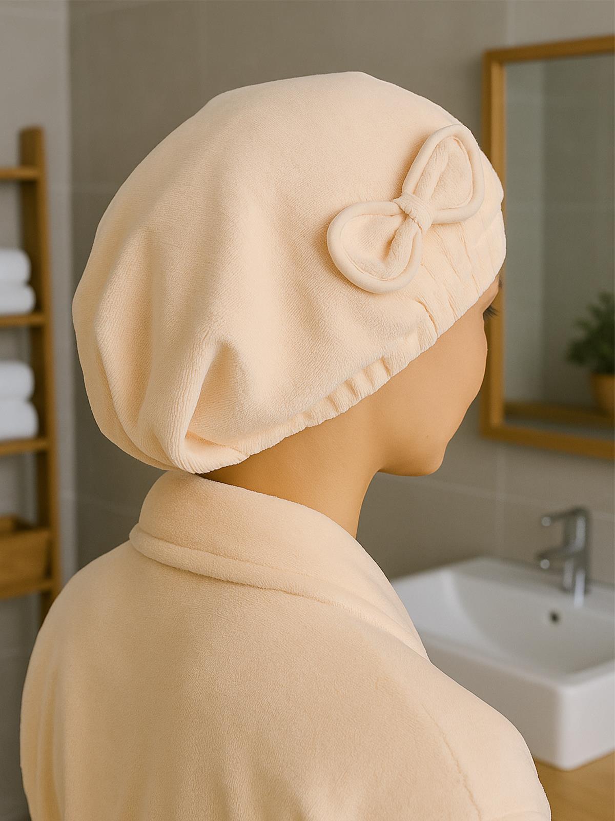 DreamSoft Saç Kurulama Bonesi – Kadife Fiyonklu Lastikli Krem