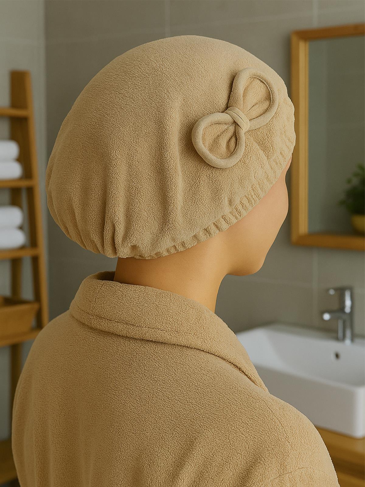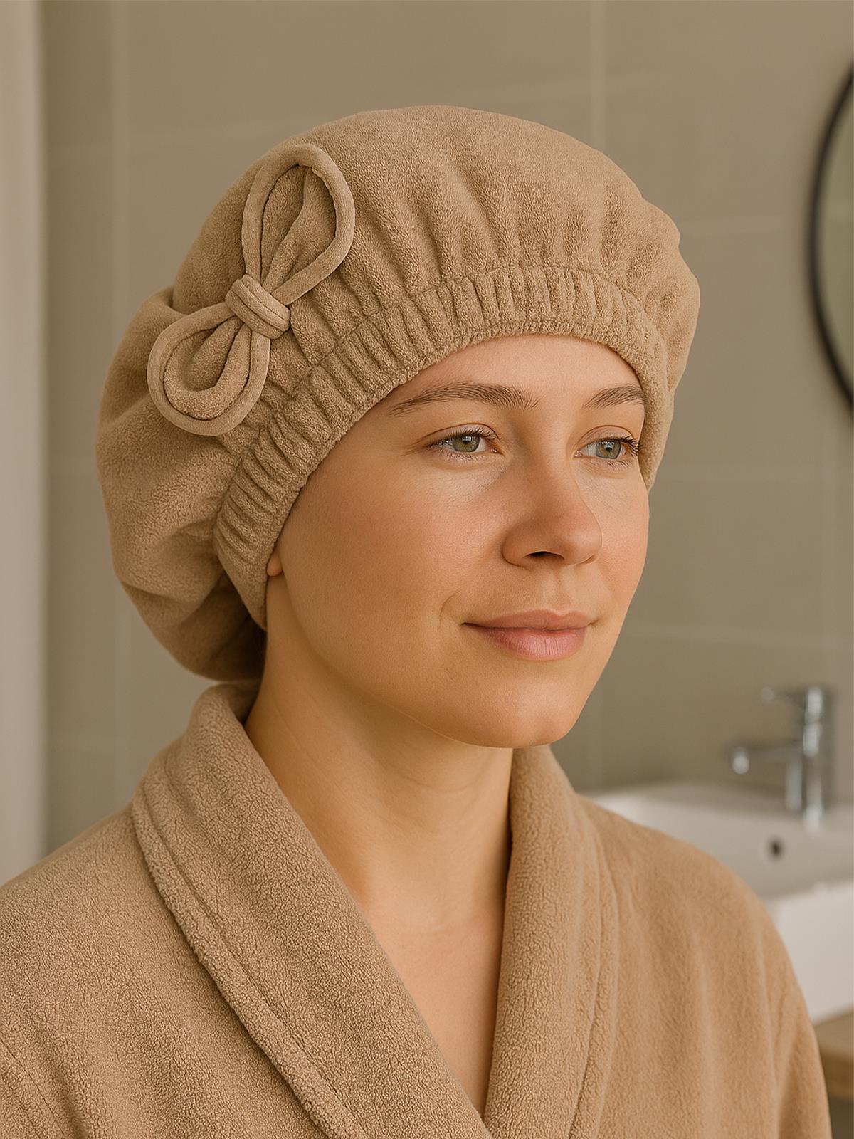 DreamSoft Saç Kurulama Bonesi – Kadife Fiyonklu Lastikli Bej