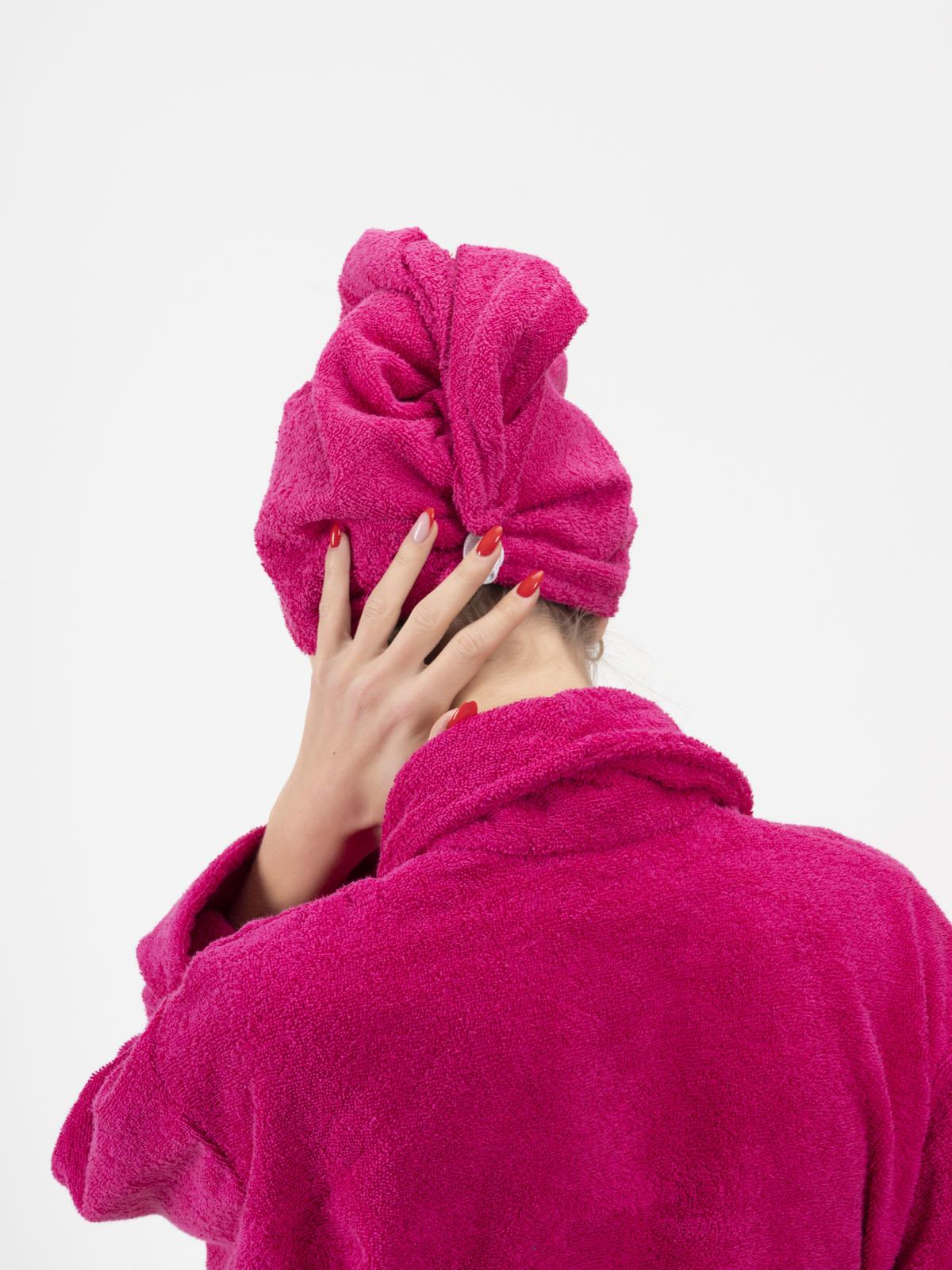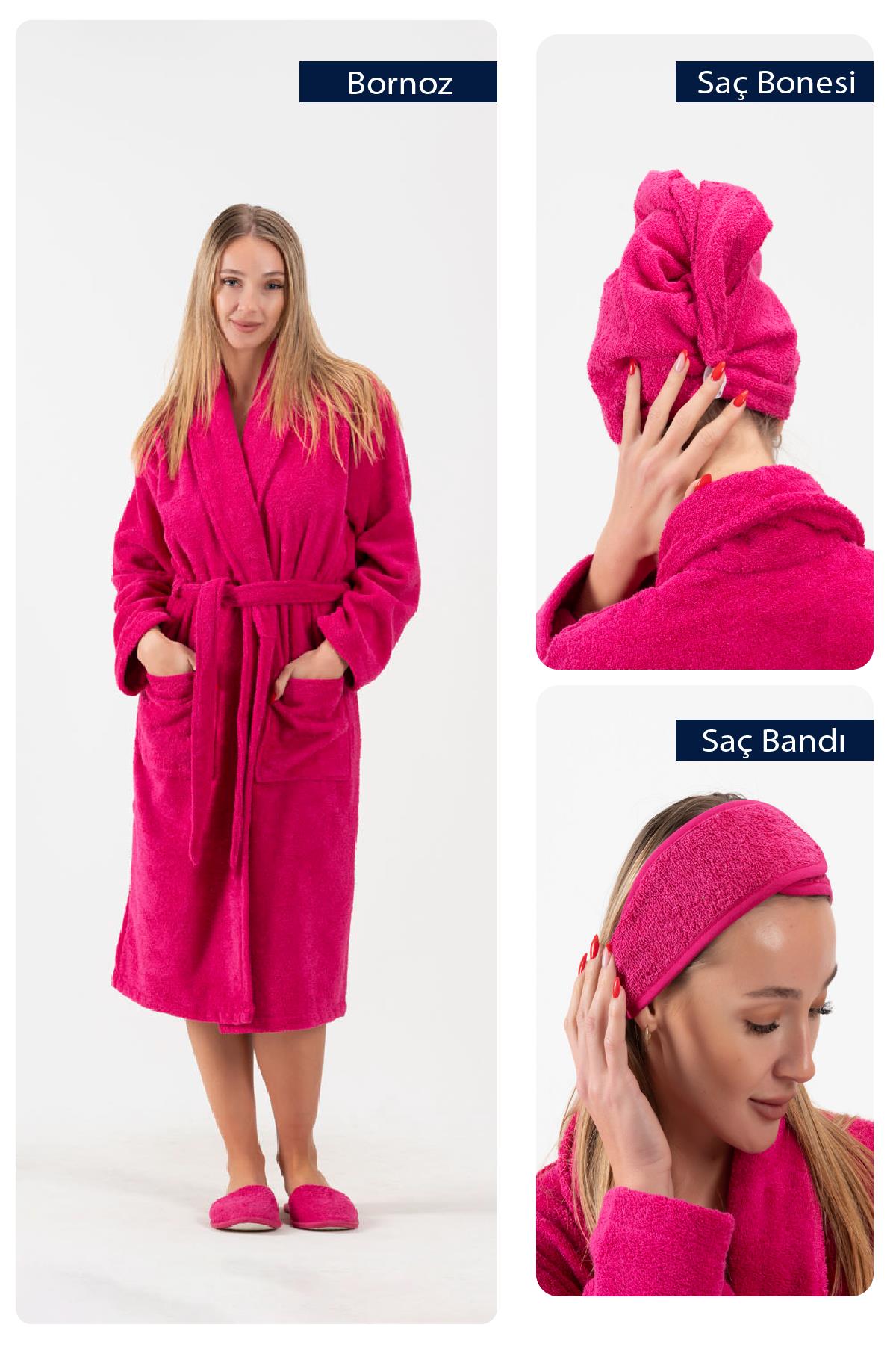 CottonVerse 3'lü Bornoz Seti - %100 Pamuk Bornoz , Saç Bonesi , Saç Bandı Unısex Fuşya