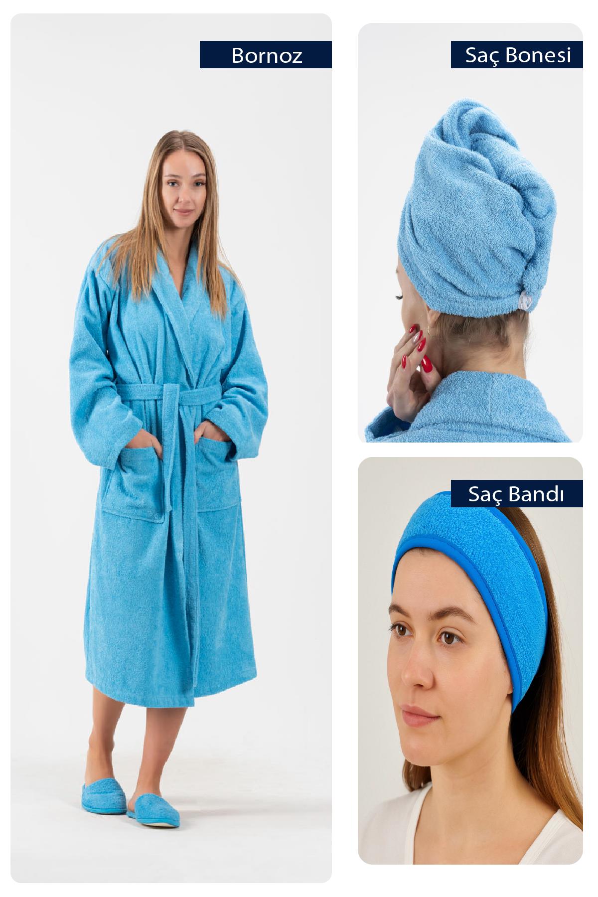 CottonVerse 3'lü Bornoz Seti - %100 Pamuk Bornoz , Saç Bonesi , Saç Bandı Unısex Mavi