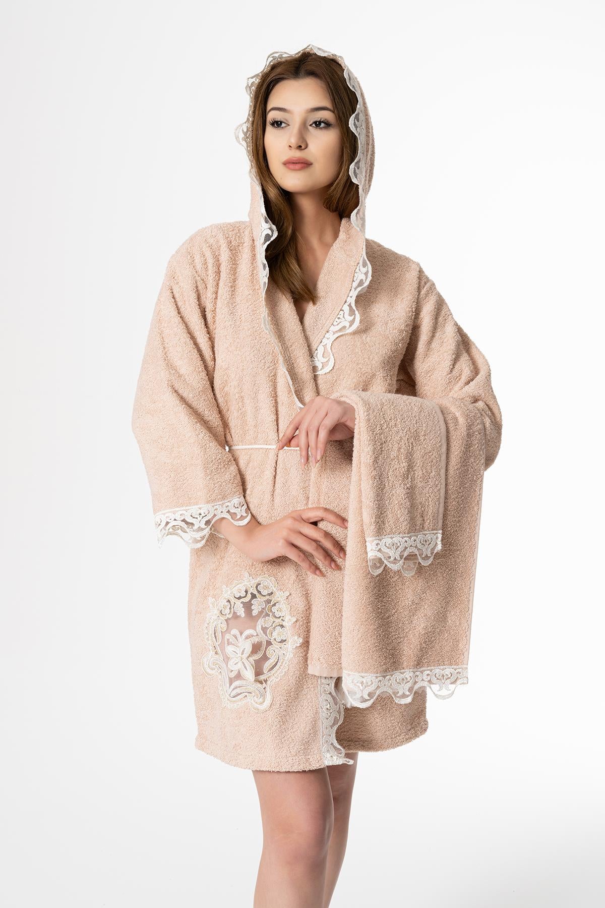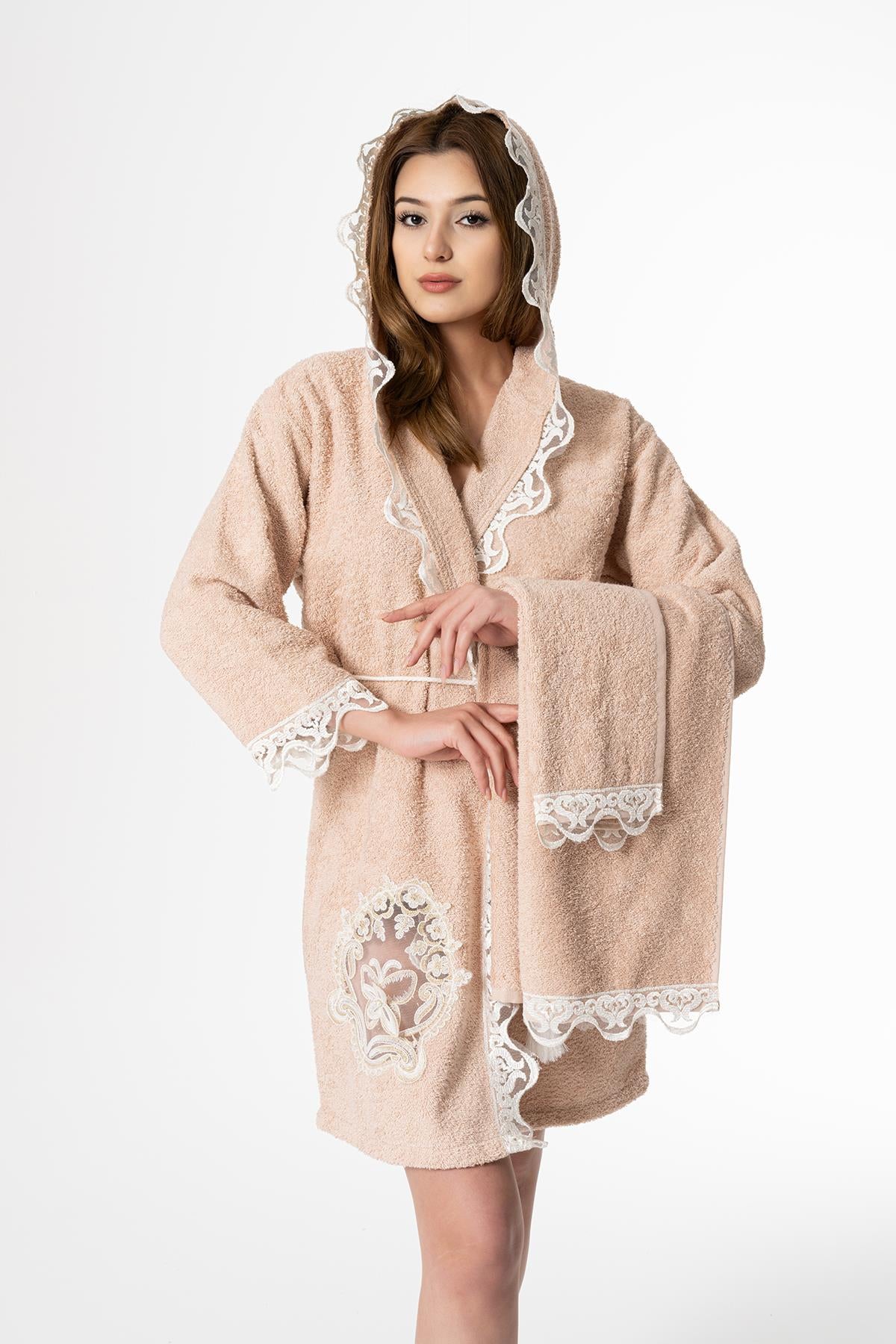 Kelebek Gelin Bornoz Set 5 Parça Dantelli Çeyizlik Takım Bej