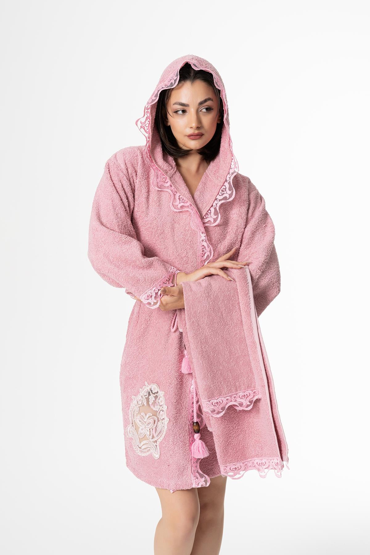 Kelebek Gelin Bornoz Set 5 Parça Dantelli Çeyizlik Takım Pembe