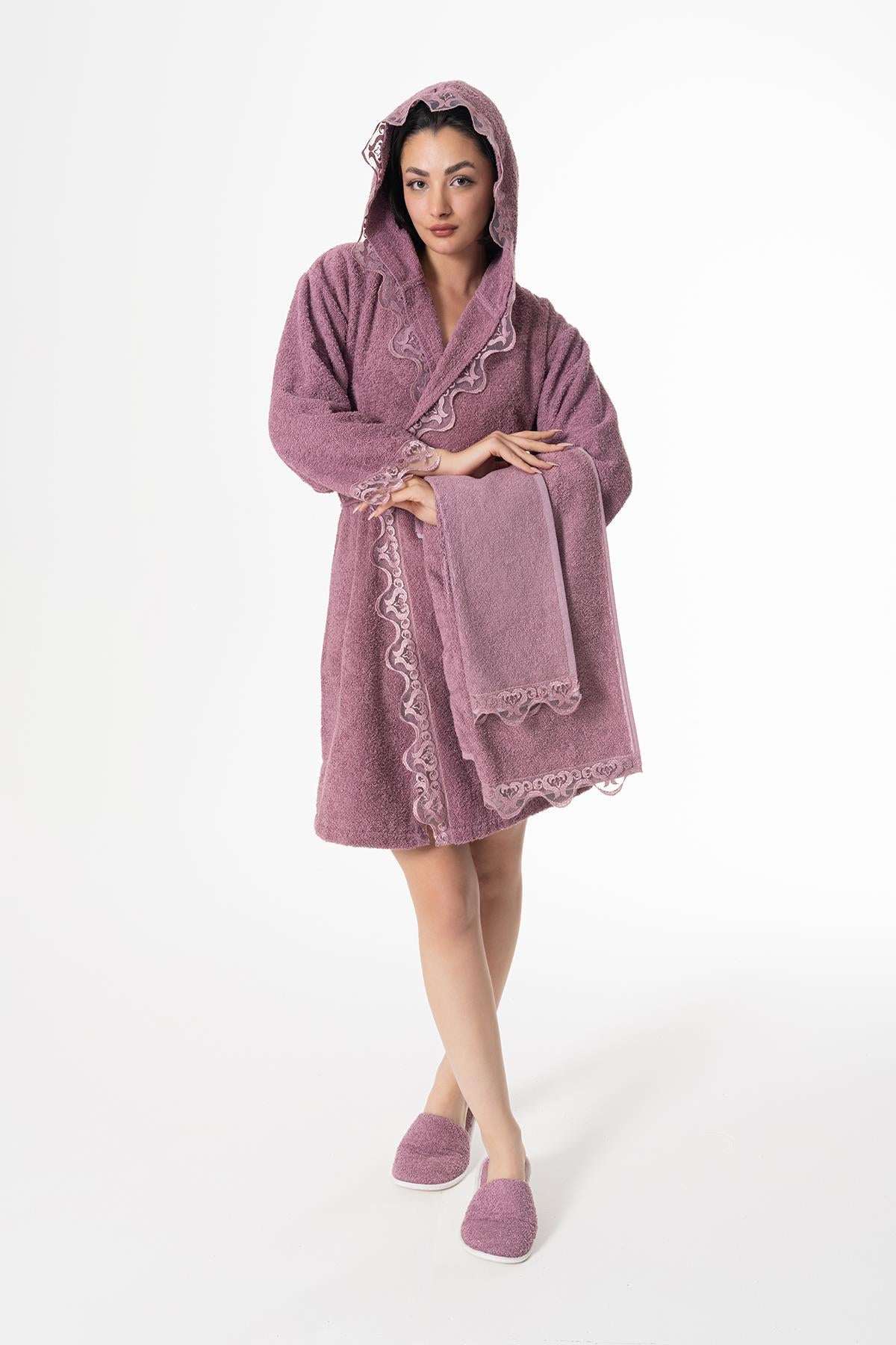 - Ender Home Pavlin Gelin Bornoz Seti 5 Parça Dantelli Çeyiz Bayan Bornoz Seti