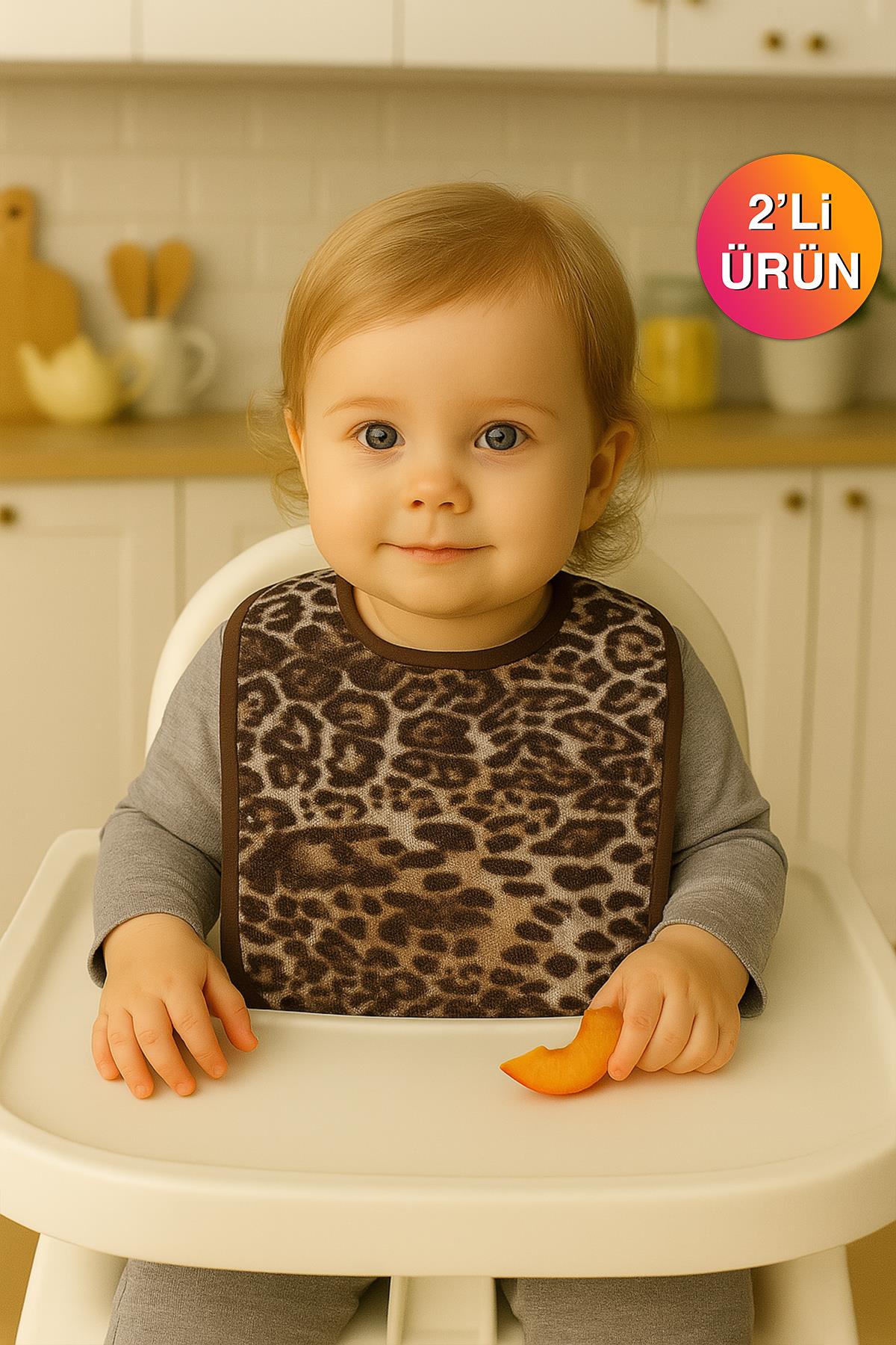 Wild Sprit 2'li Leopar Desen Havlu Bebek Mama Önlüğü - 25x30Cm Leopar Baskılı- Kahve Biyeli