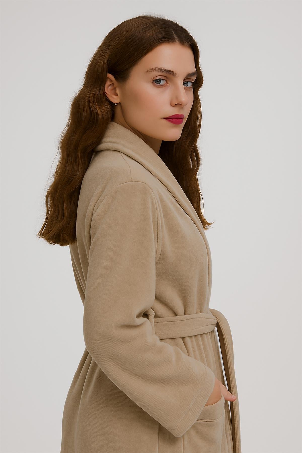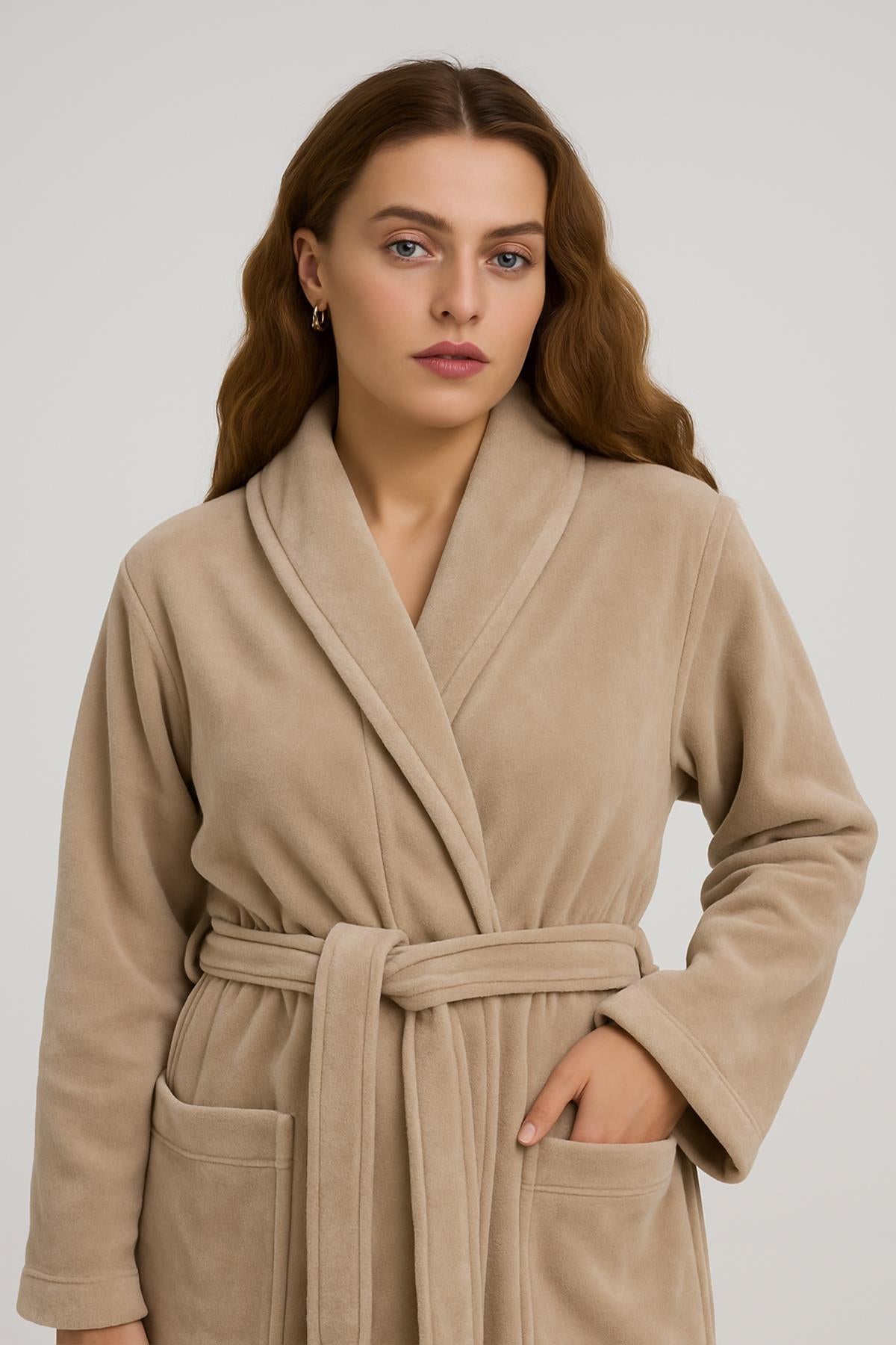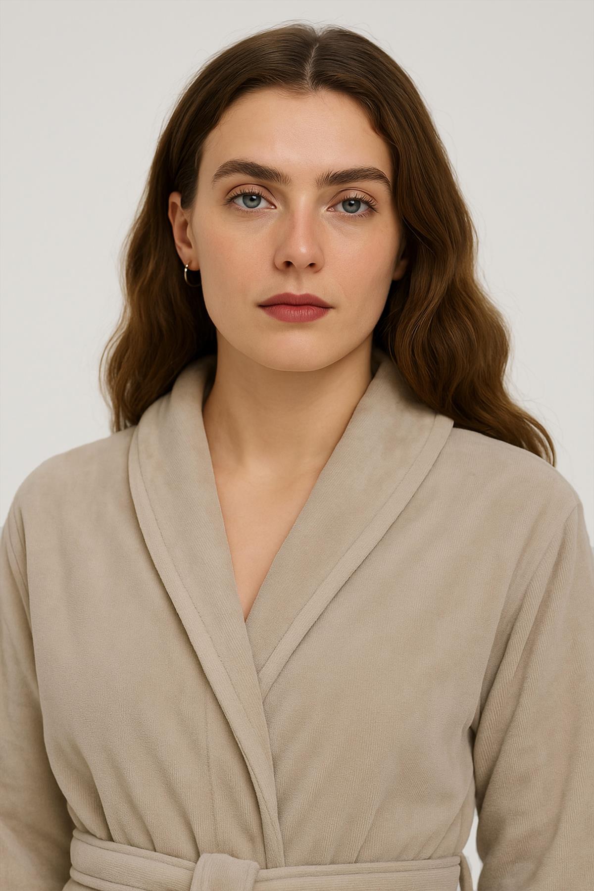 - Ender Home Bornoz Bej İndantren Kadife Şalyaka Banyo Bornozu