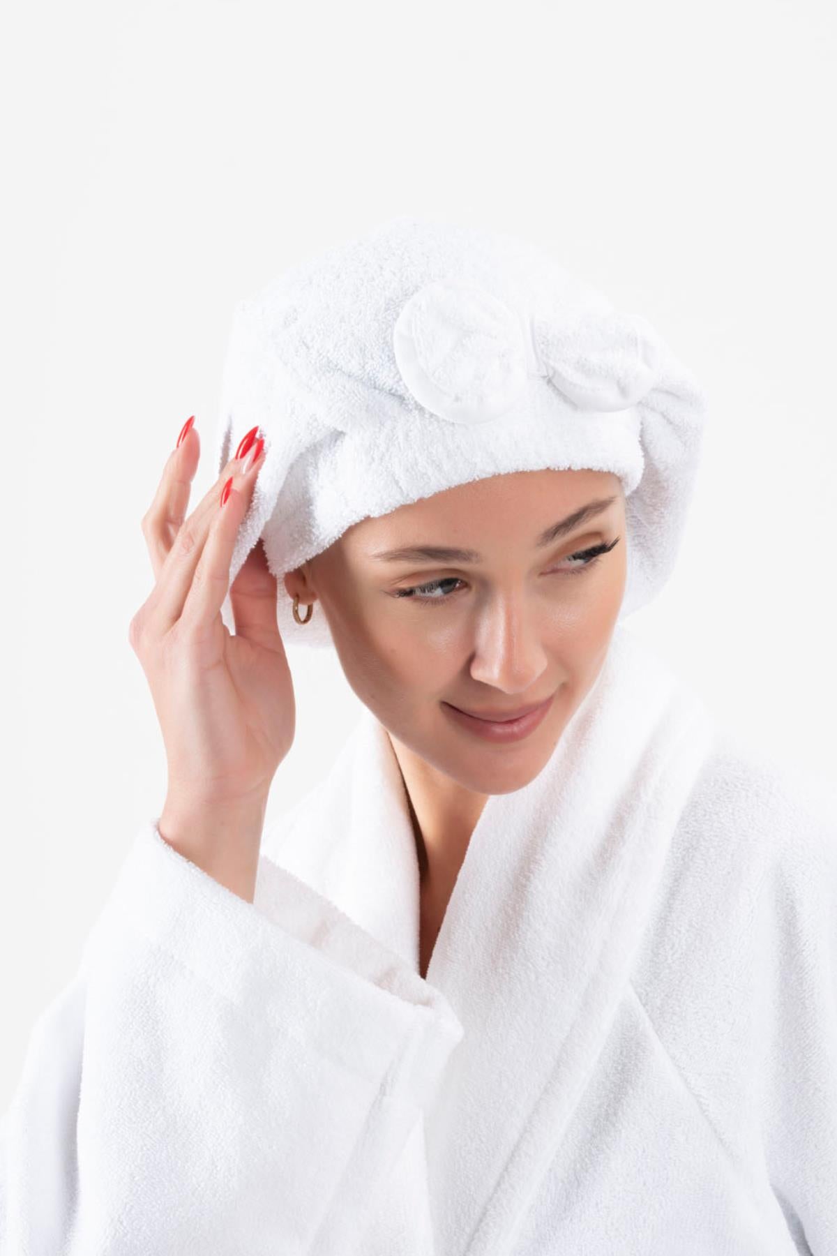 CottonVerse Saç Kurulama Bonesi – %100 Pamuk , Fiyonklu Beyaz