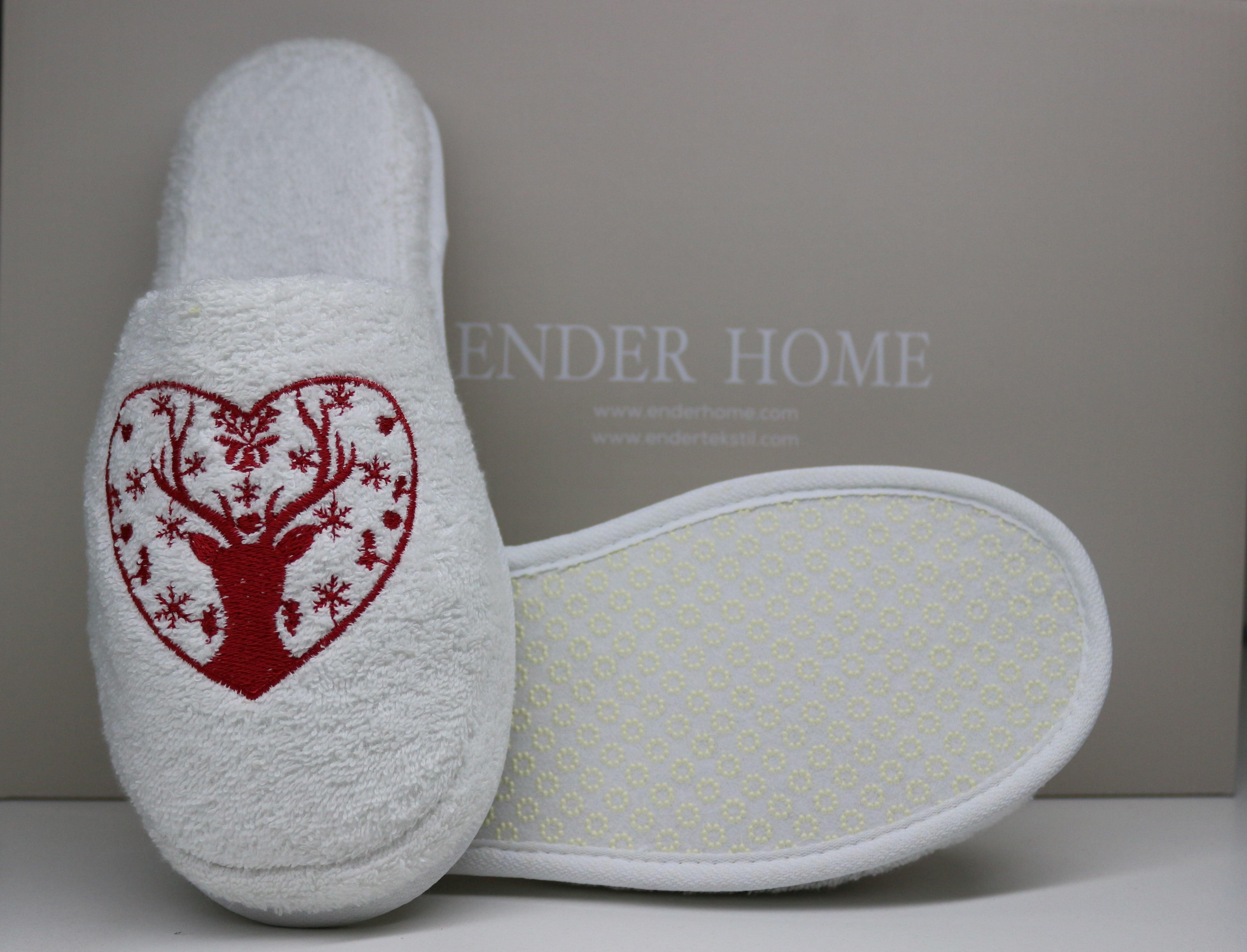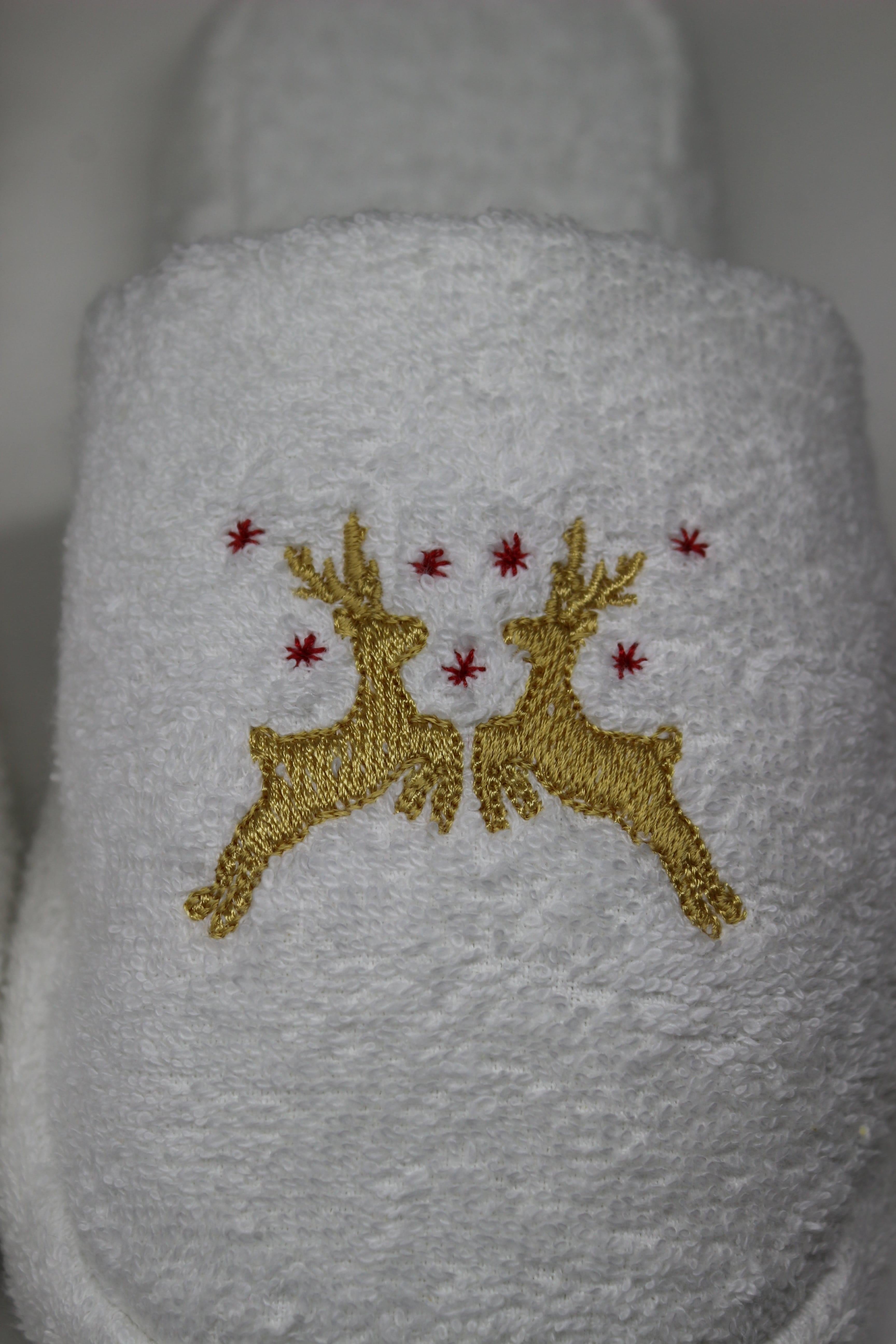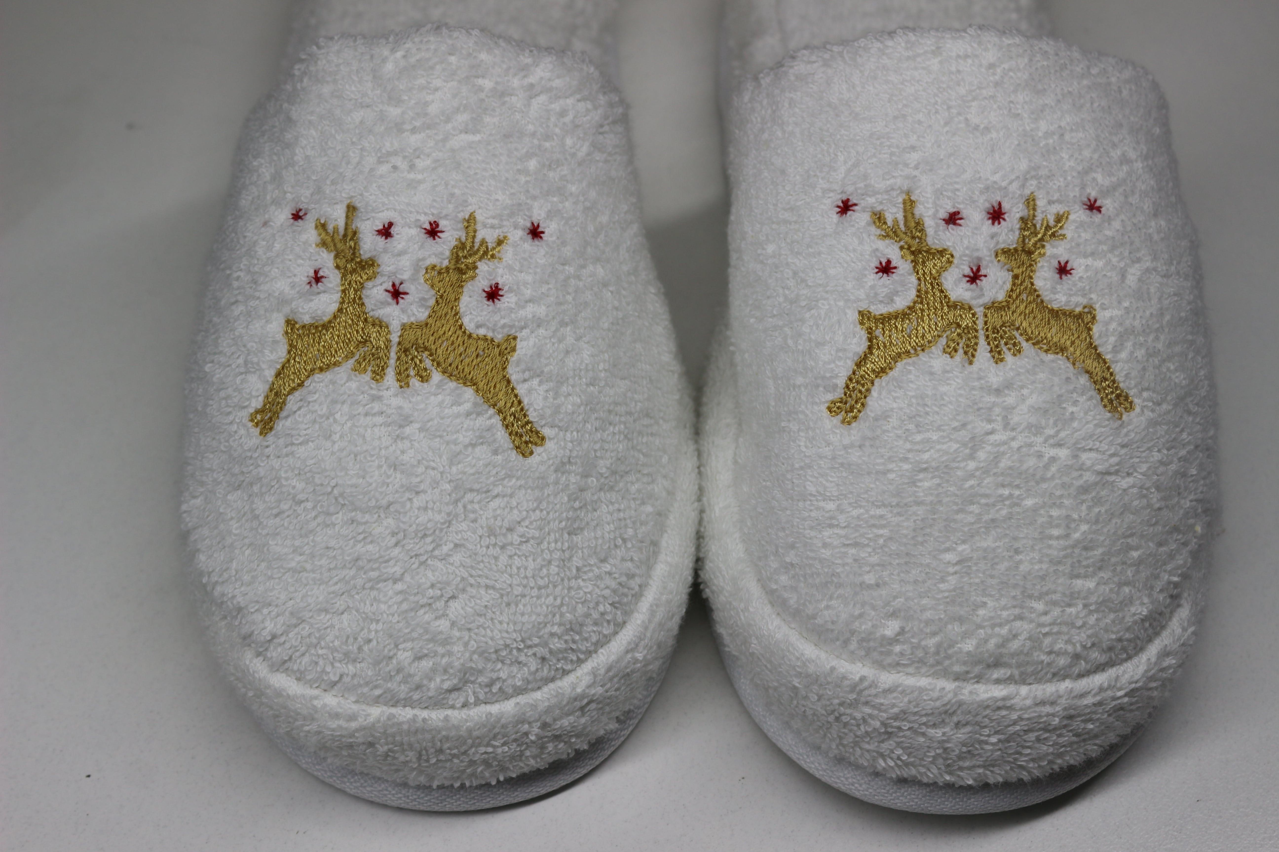 Geyik Nakışlı Banyo Ve Ev Terliği – %100 Pamuk Havlu Kaymaz Kalın Taban Beyaz