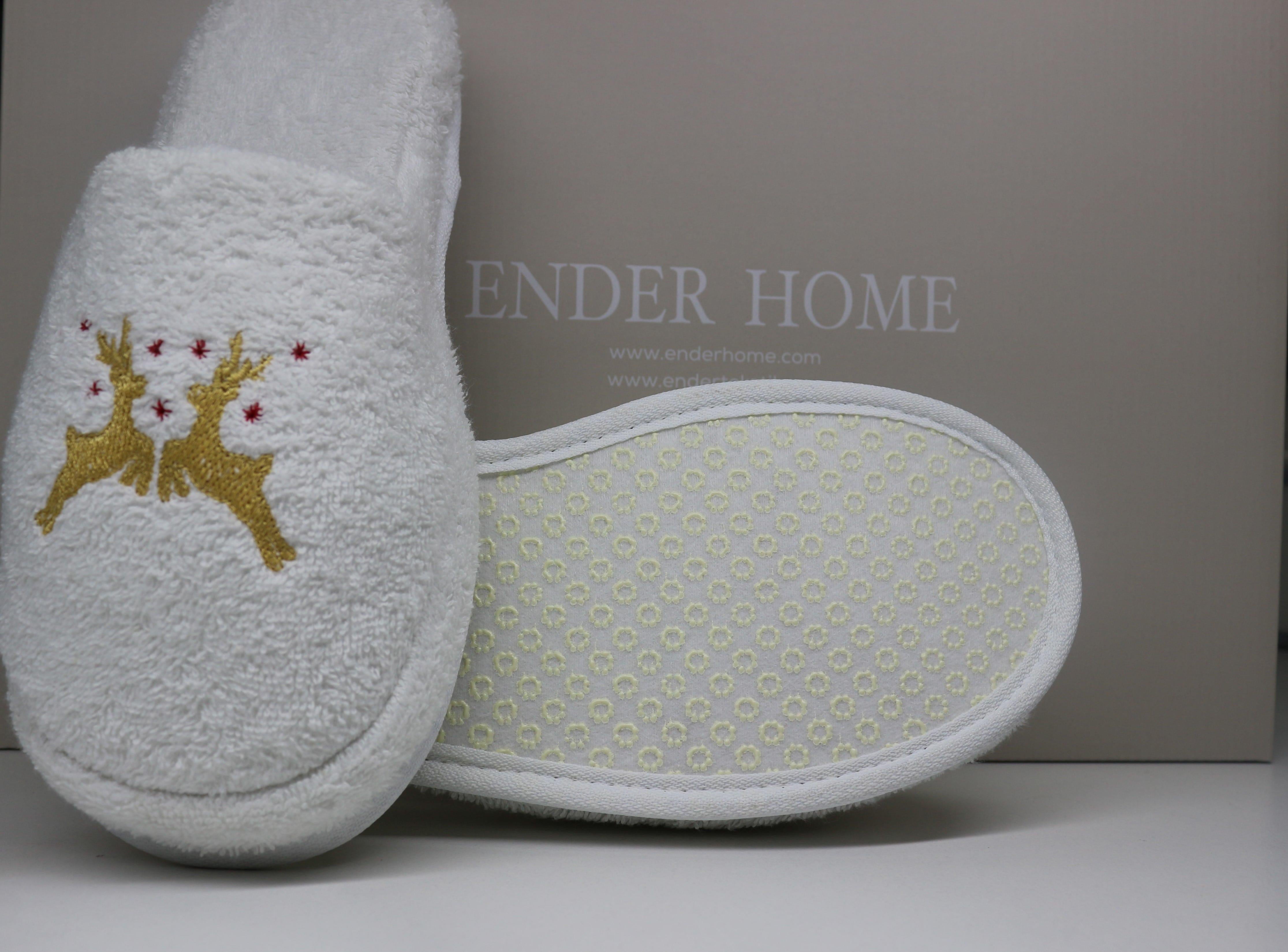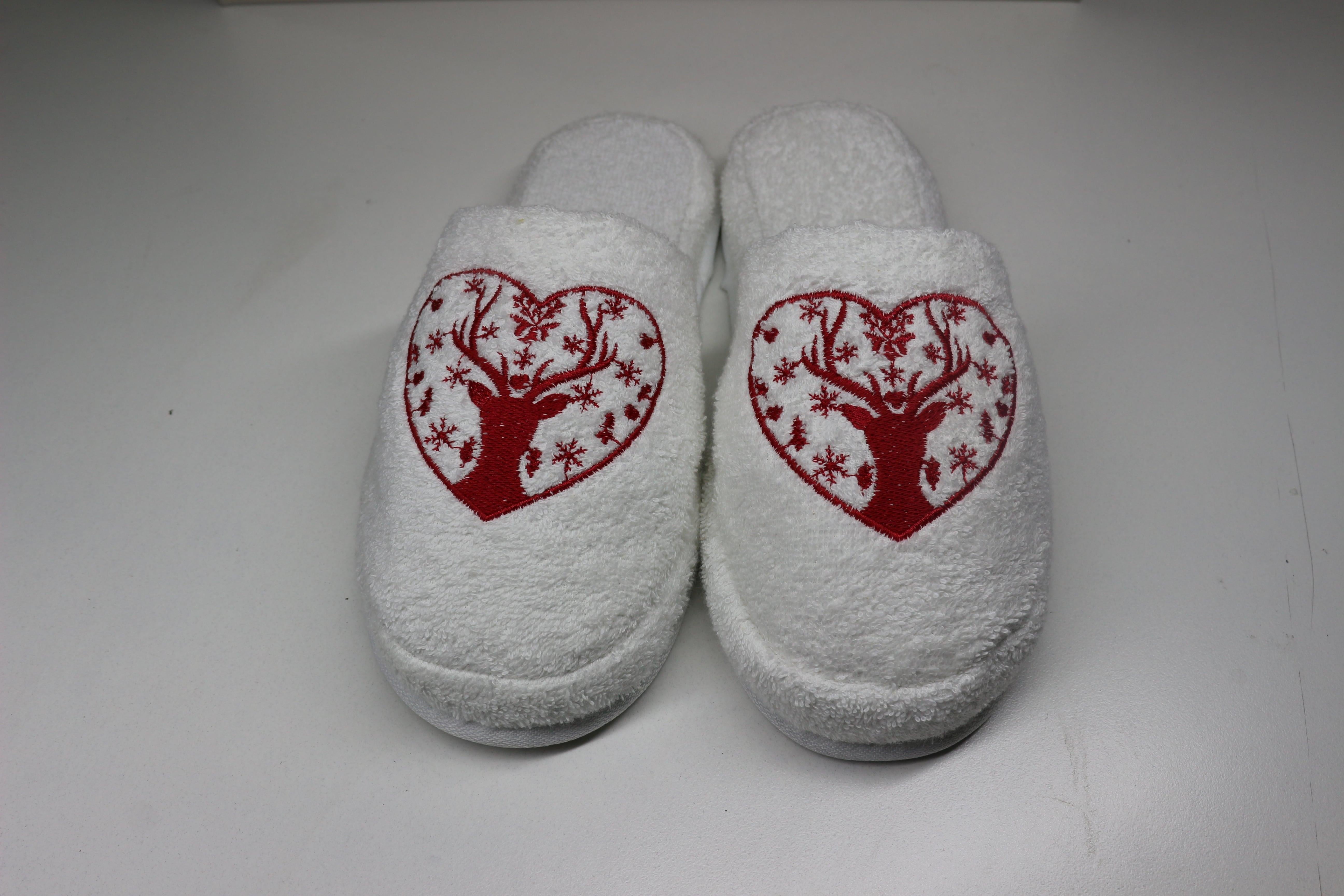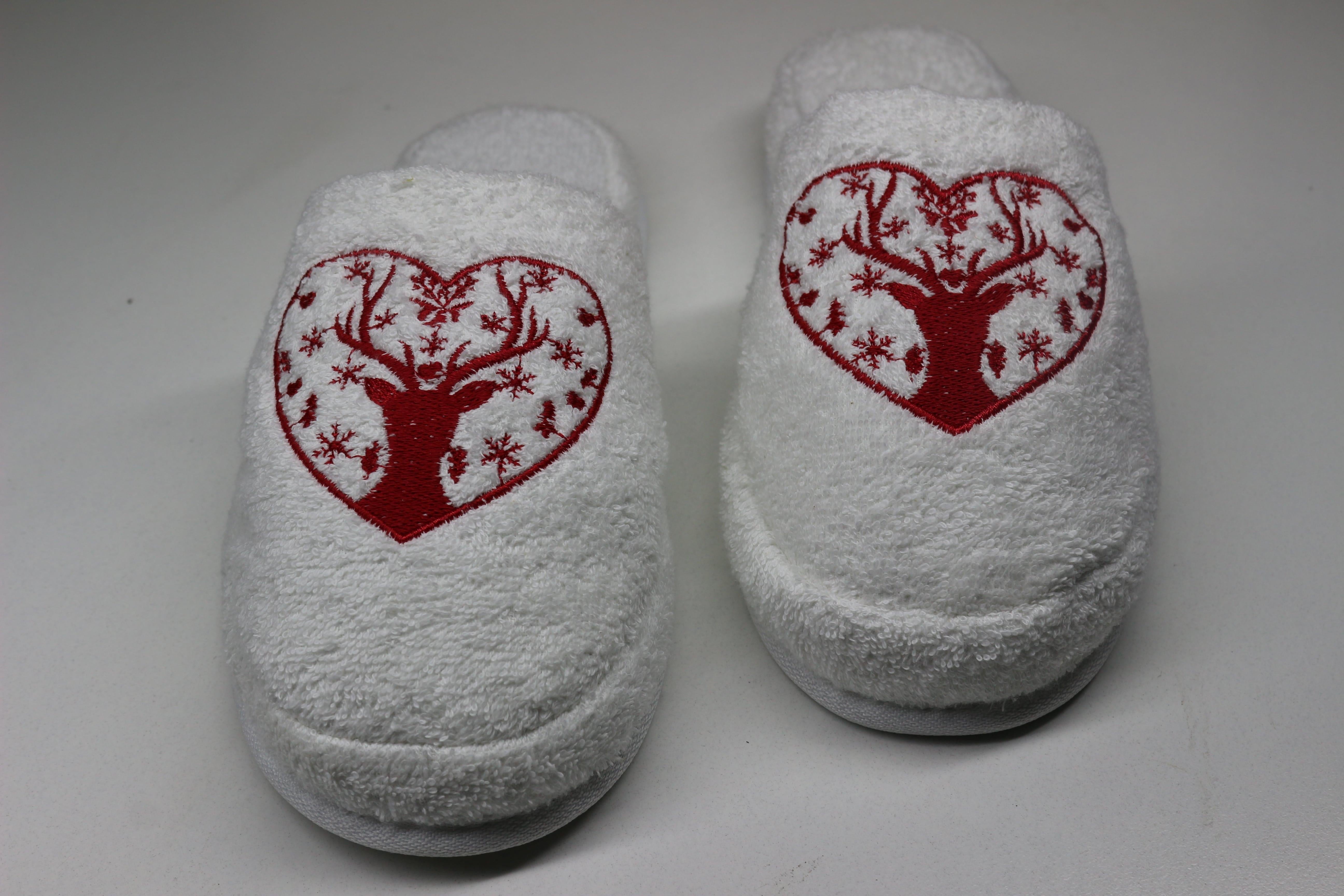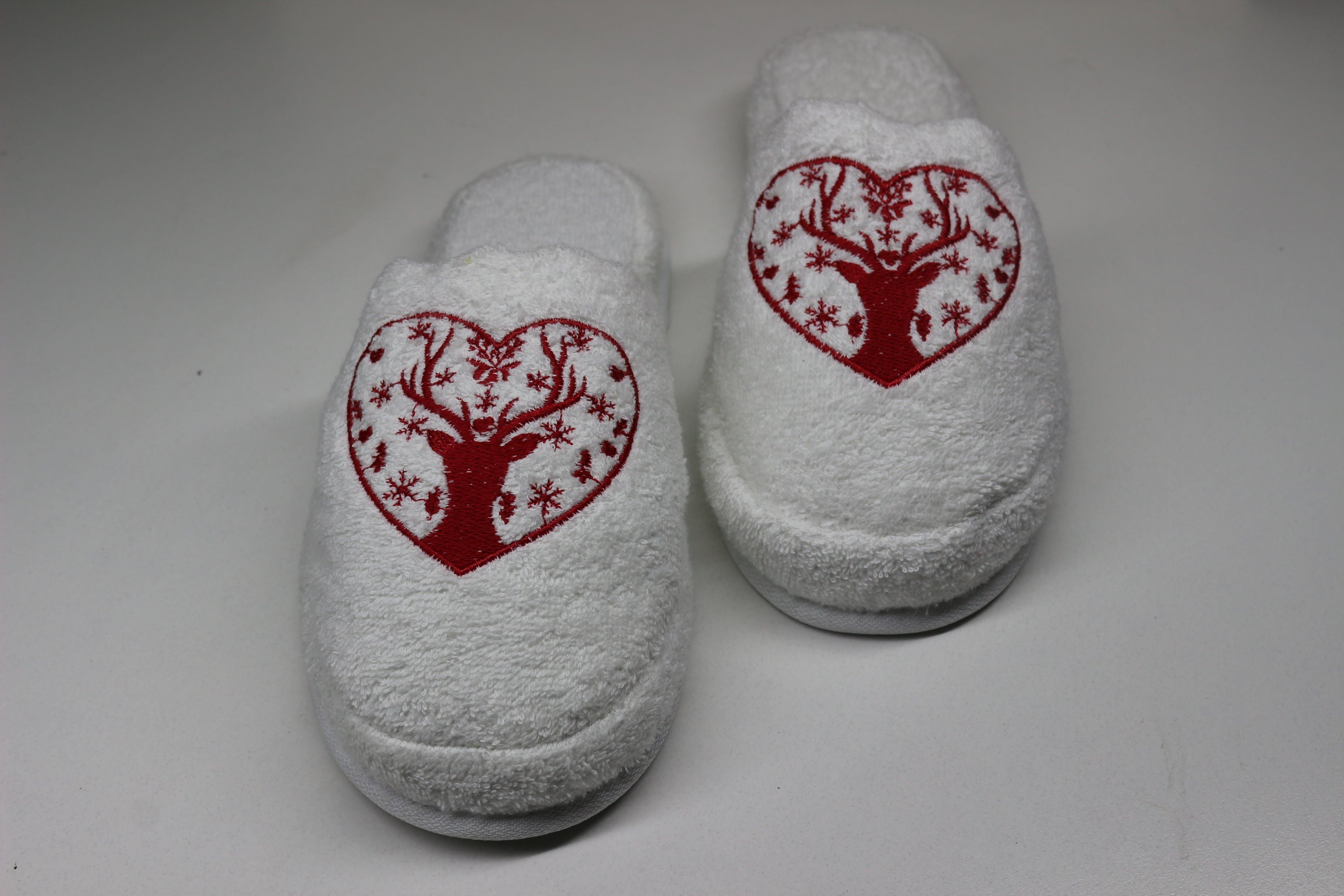 Geyik Nakışlı Banyo Ve Ev Terliği – %100 Pamuk Havlu Kaymaz Kalın Taban Beyaz