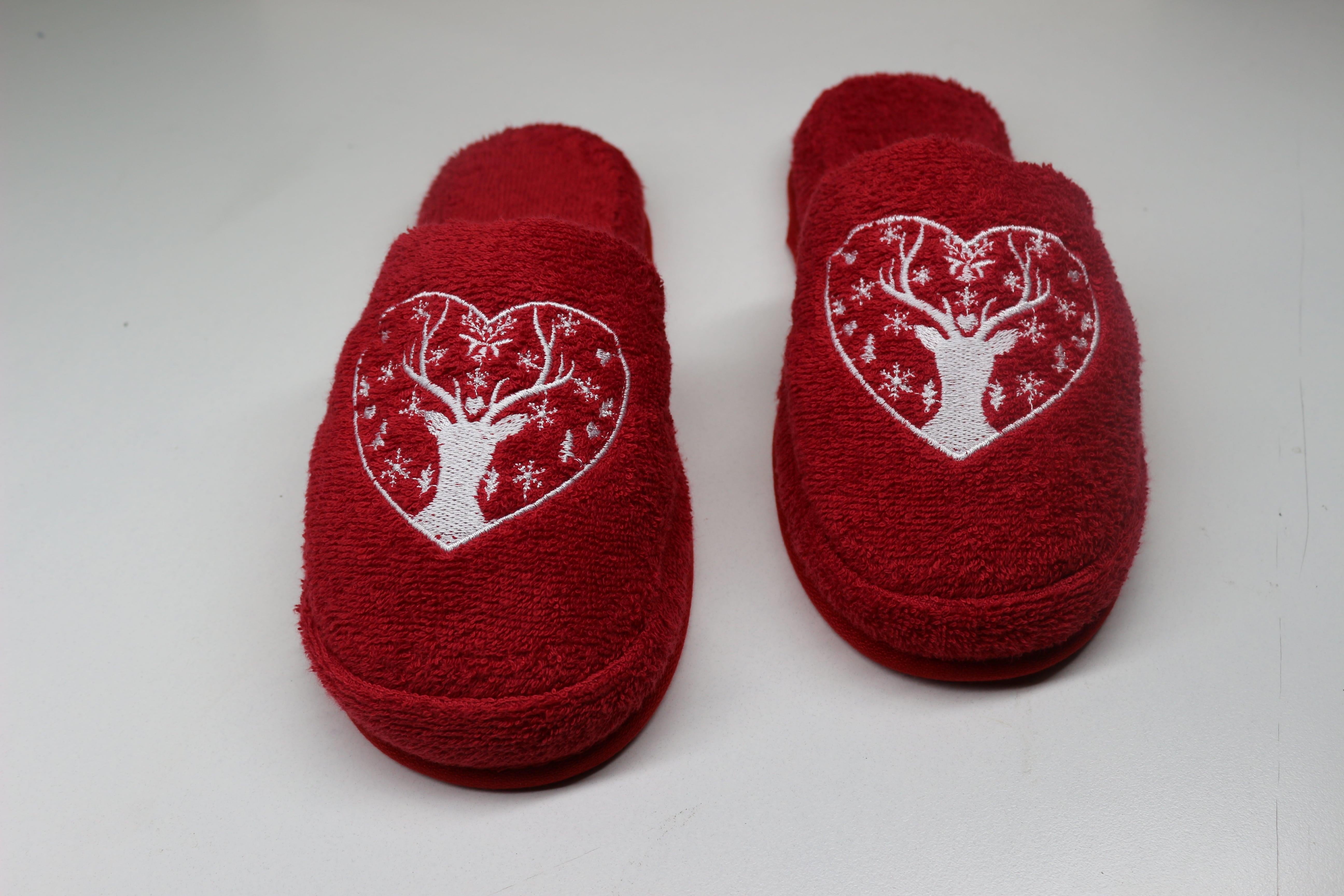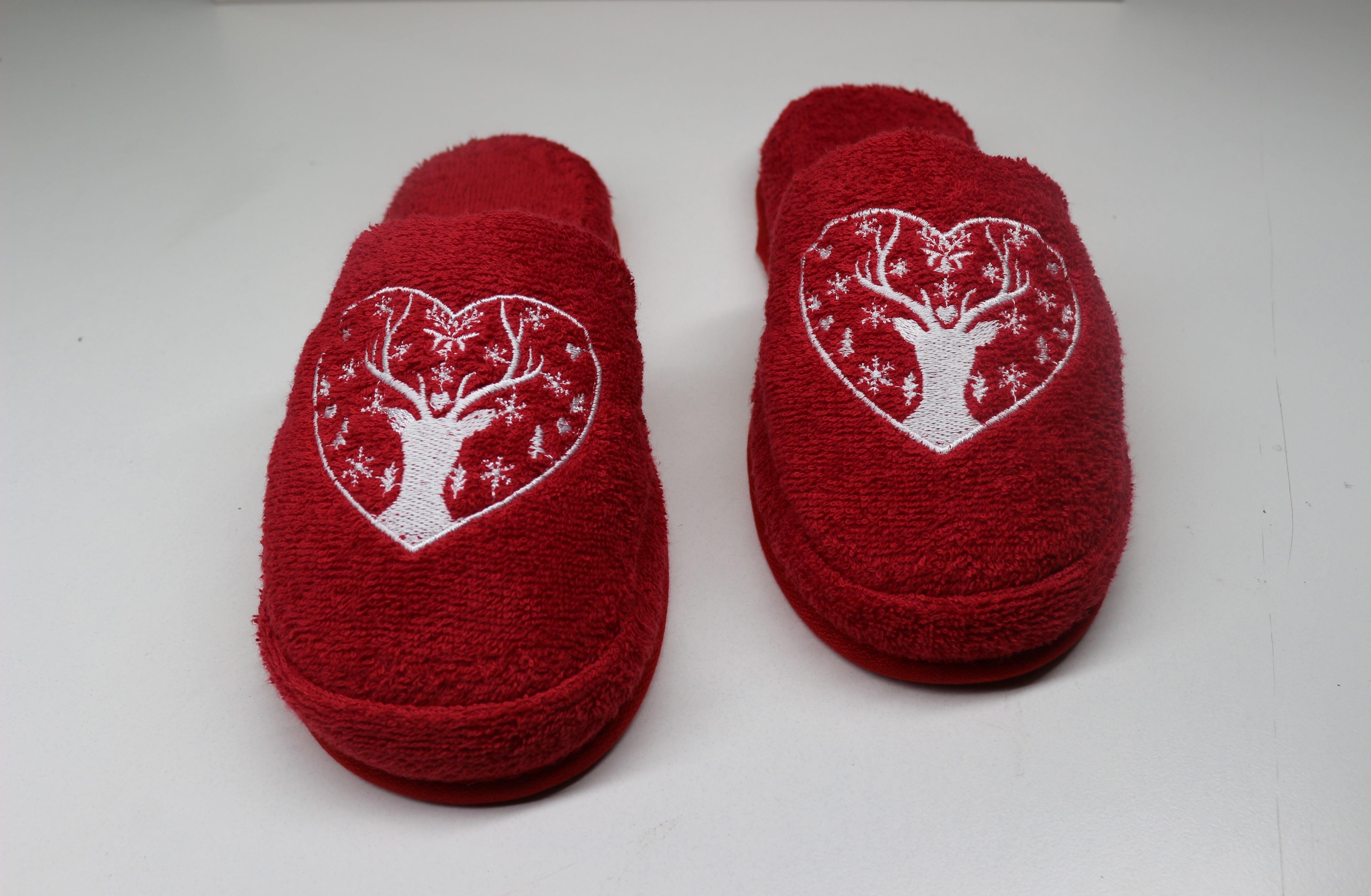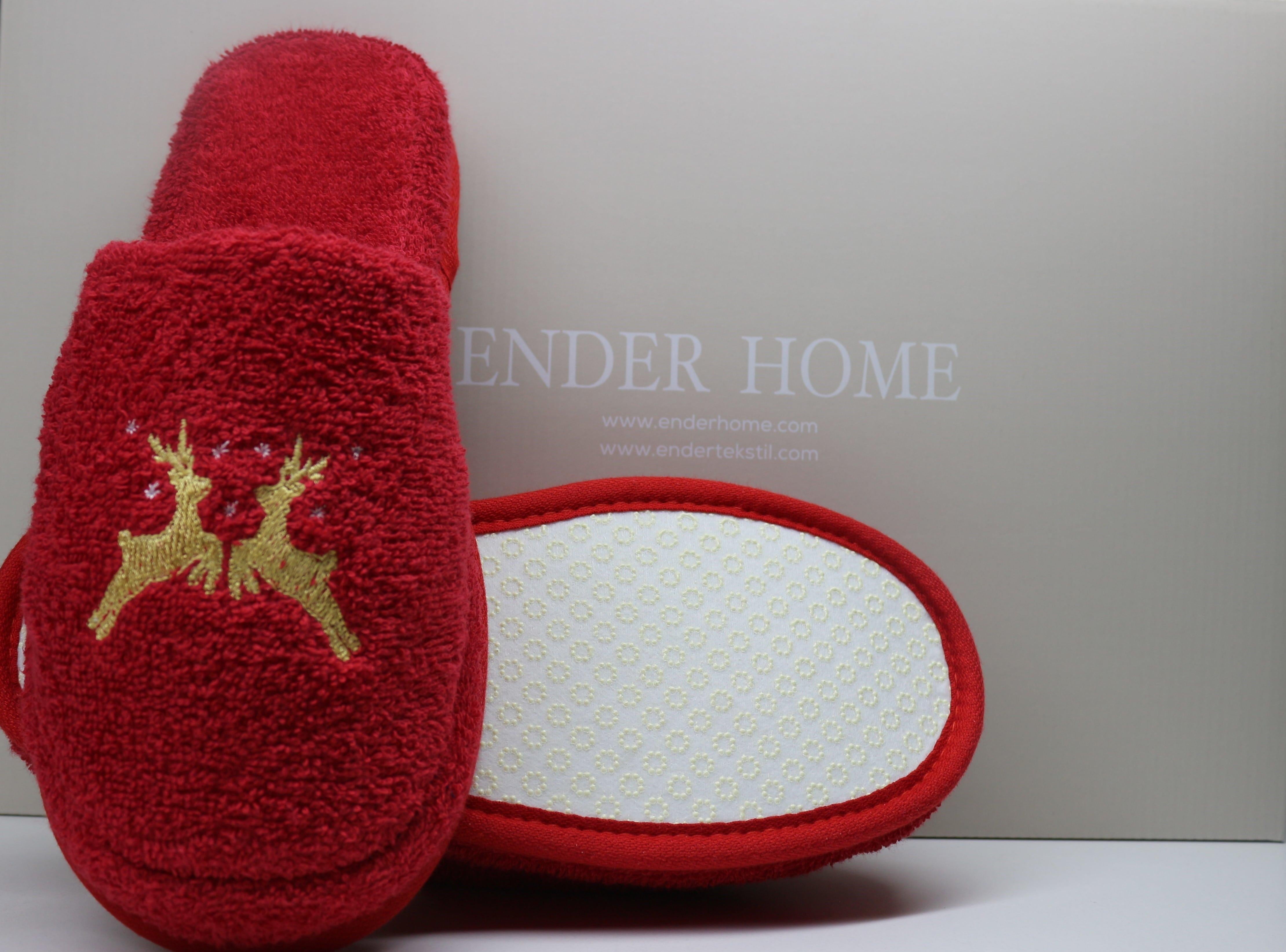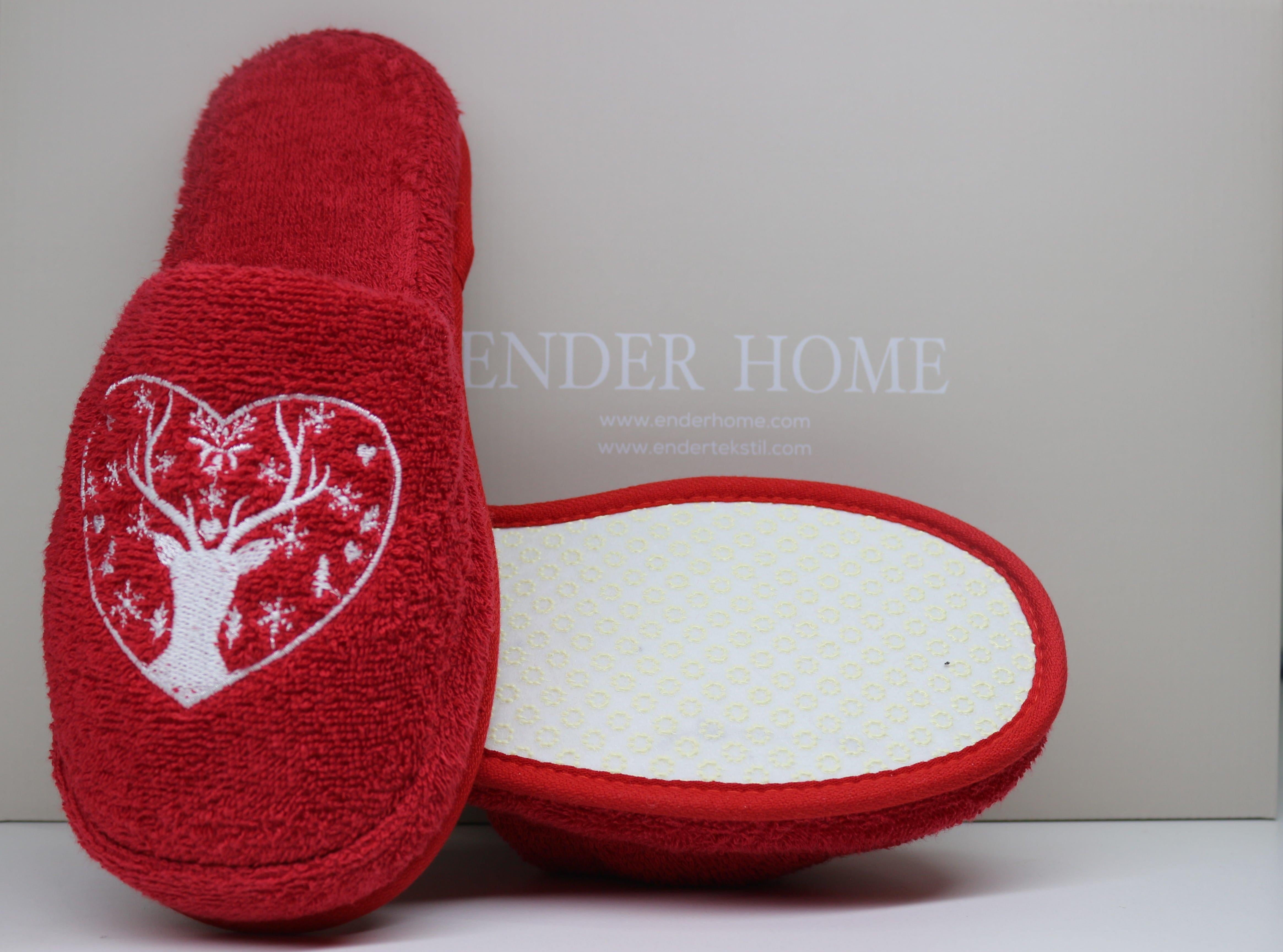 Geyik Nakışlı Banyo Ve Ev Terliği – %100 Pamuk Havlu Kaymaz Kalın Taban Kırmızı