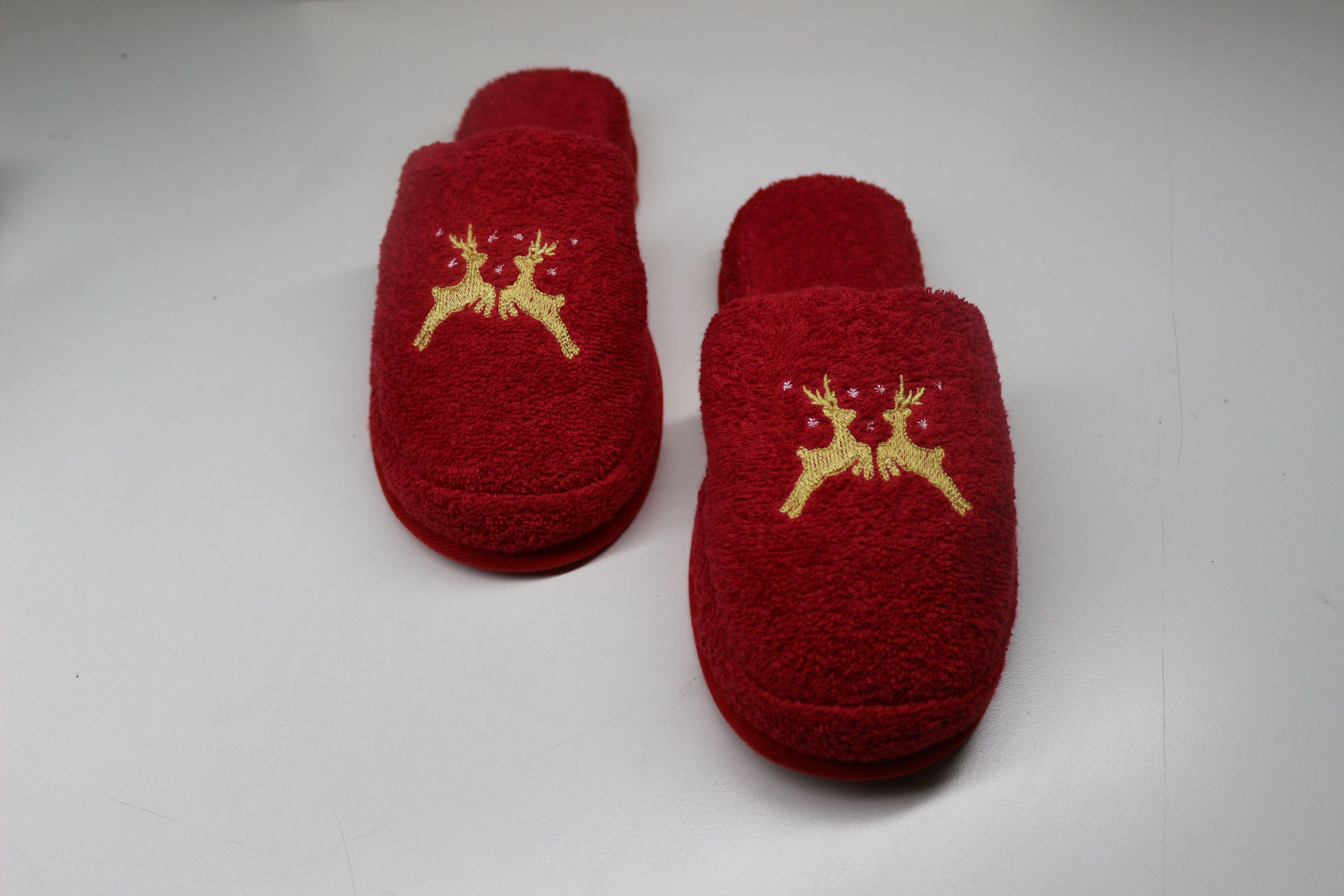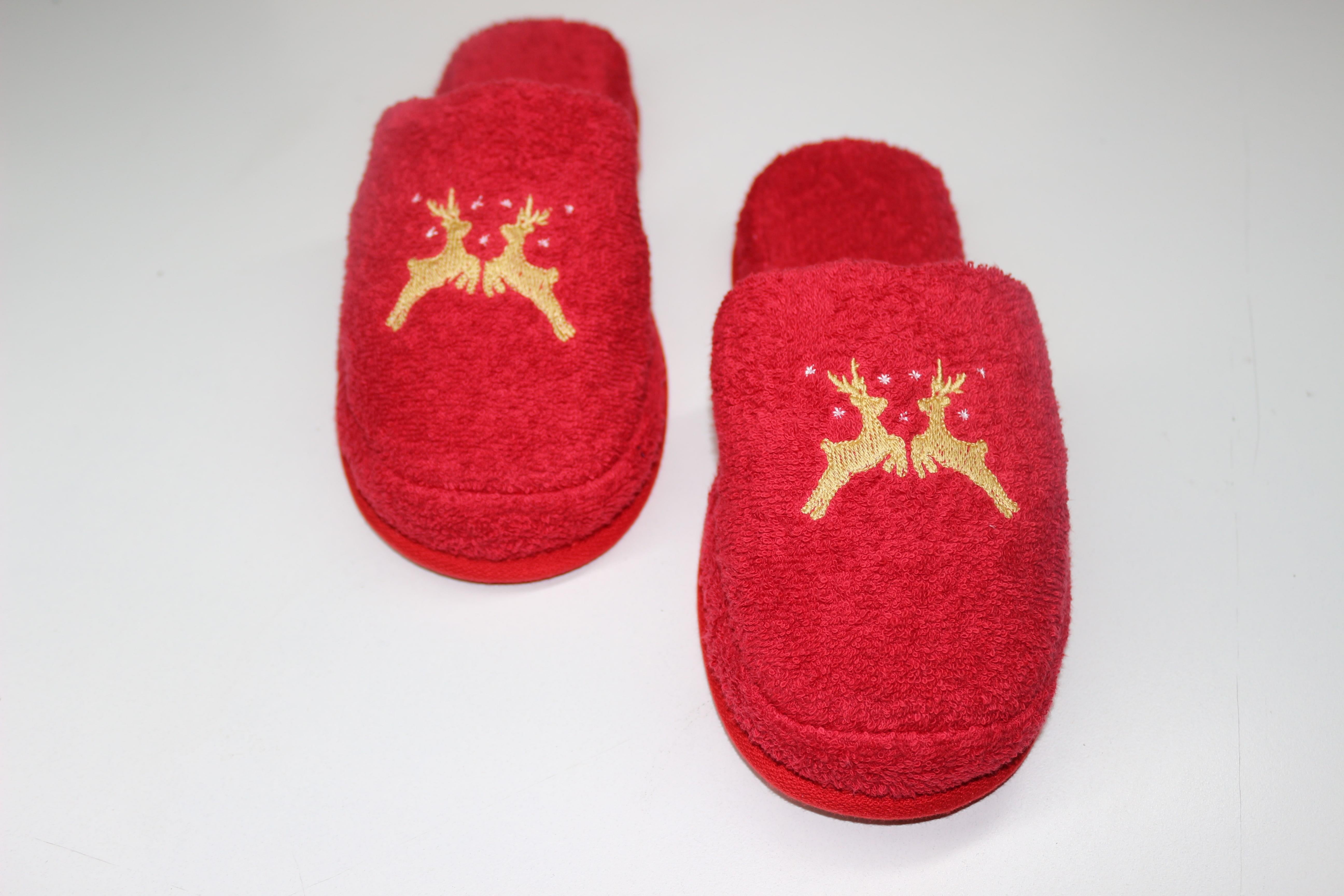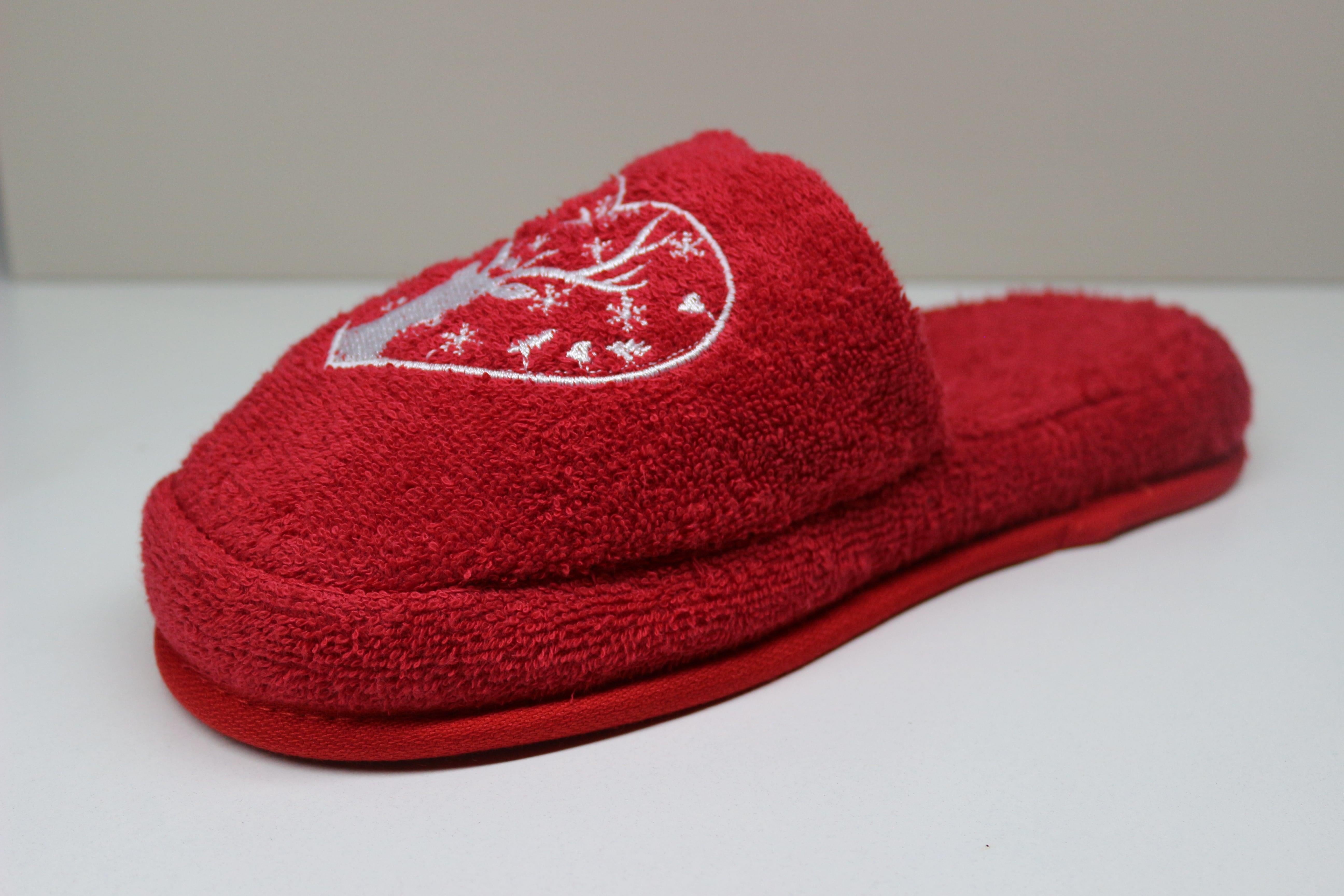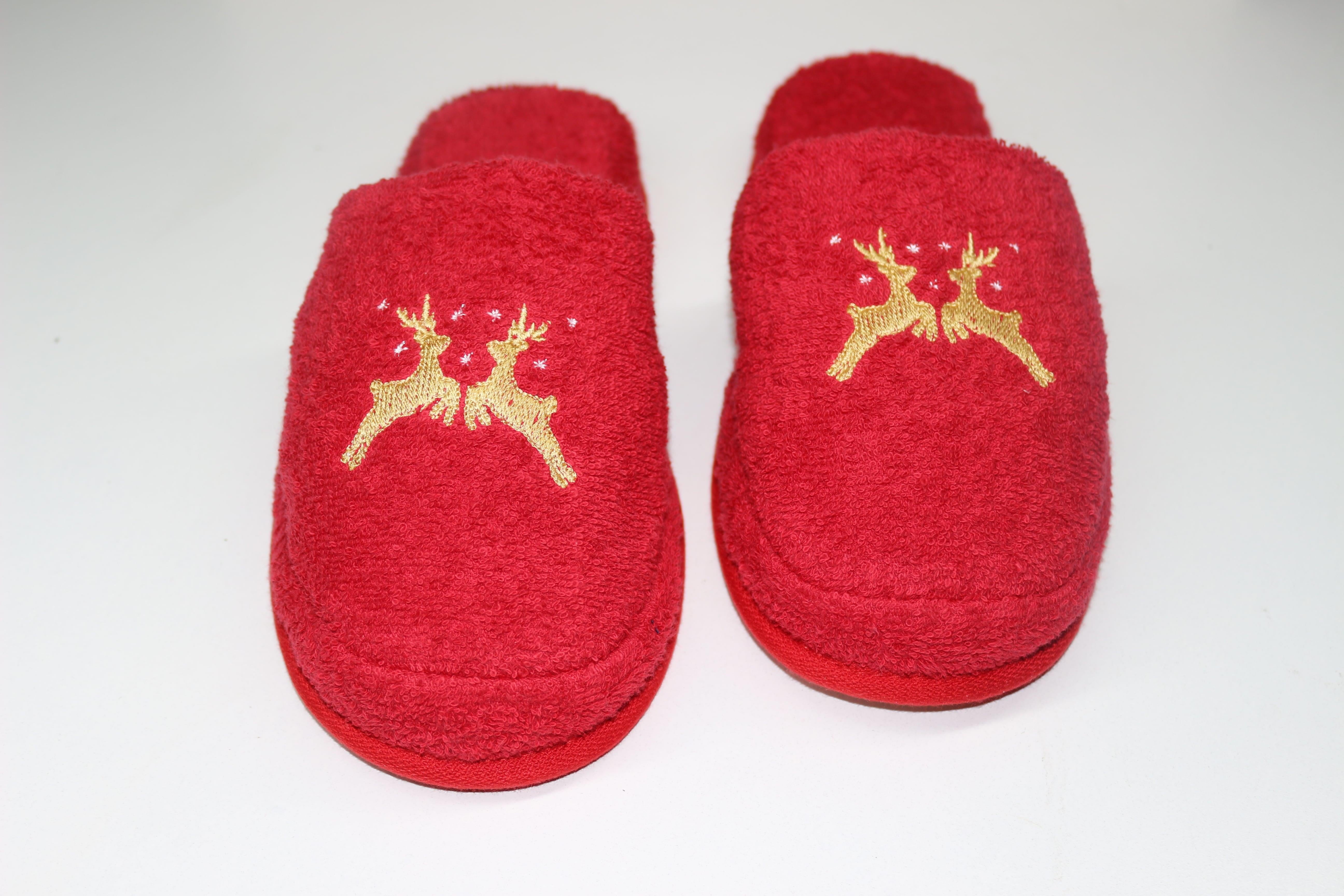 Geyik Nakışlı Banyo Ve Ev Terliği – %100 Pamuk Havlu Kaymaz Kalın Taban Kırmızı